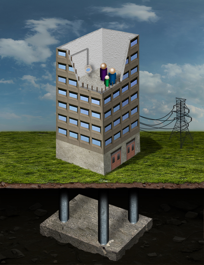 Earthquake engineering illustration - bedrock support to mitigate soil liquefaction damage.